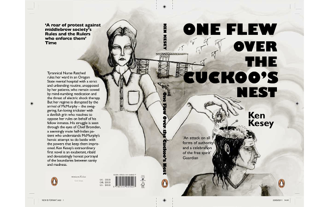 Here are some examples of cover art for other editions of One Flew Over the Cuckoo's Nest. I really like these different depictions that emphasize the Chief's part in the story. In the first one, I really like the depiction of the Nurse who looks cruel and machine-like. I also think the idea of her taking out parts of the Chief's brain is very accurate, as she figuratively brainwashed many of the patients on the ward and literally took out part of McMurphy's brain. The second one is much simpler, but shows the Chief (or possibly another patient) going through shock therapy. The figure looks very robot like, though the viewer can tell that it is at least partially human, much like the patients on the ward. Finally, I love the image of the brain with one puzzle piece missing. I think this is a very good visual for the Chief's and other mental patients' brains, as they are not quite all there; however, in some cases it is possible for the piece to be found and returned to its proper place, like for the Chief when he leaves the ward and seems to exhibit general sanity.
